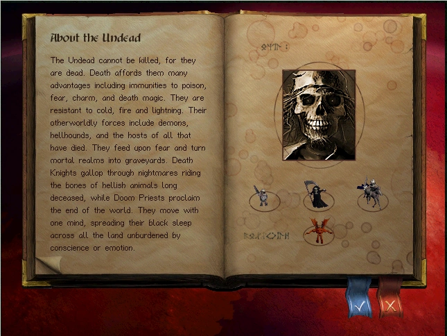 Meandor fled, leaving me to choose between Inioch and his cowardly son. Meandor claims that a mistake has been made. I will agree with him. A mistake has been made. That mistake was my allegiance to the wrong Master. The other Stormlords scramble to cover their fiefdoms, and hide from the powers of these new gods: the Undead. I will not be the one that grovels for his life when this engagement is over. Inioch has promised me dominion over all living creatures for the duration of this world. Ultimately, I decide who lives and who perishes. I will finish the work abandoned by Meandor, and crush Humanity; but first, Inioch desires a place of power: A mountain called "the Skull." For centuries the Dark Elves have perfected their dark magic within this mountain. It is a sacred place of death, where Meandor learned the blackest arts, even those that brought Inioch back to the world. The Skull burns hot with the return of the Undead. It is befitting that Inioch should desire it for his necromancers. Should the Dark Elves resist, I will see their bones dance for their true king. About the Undead: The Undead cannot be killed, for they are dead. Death affords them many advantages including immunities to poison, fear, charm, and death magic. They are resistant to cold, fire and lightning. Their otherworldly forces include demons, hellhounds, and the hosts of all that have died. They feed upon fear and turn mortal realms into graveyards. Death Knights gallop through nightmares riding the bones of hellish animals long deceased, while Doom Priests proclaim the end of the world. They move with one mind, spreading their black sleep across all the land unburdened by conscience or emotion.